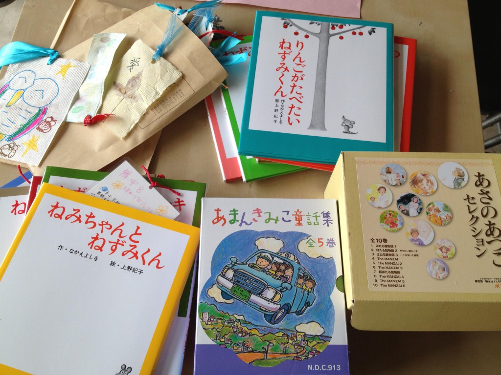 京都の舞鶴市内にある、8つの中学校の子どもたちが、「東北のために自分たちが出来ることを」と、「舞中8絆プロジェクト」というプロジェクトを立ち上げ、約2か月間、アルミ缶を回収し、その収益で絵本を購入。 たくさんの手作りのしおりも作成し、「みんなのとしょかん」へ寄付してくれました。